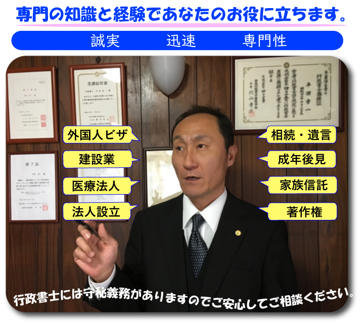 - 当事務所は、広島県福山市にある外国人ビザ(在留資格・VISA)、相続、遺言、成年後見、家族信託、法人設立、建設業許可、医療法人許認可、著作権の手続などに特化した行政書士事務所です。