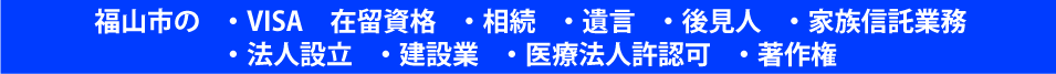 - 当事務所は、広島県福山市にある外国人ビザ(在留資格・VISA)、相続、遺言、成年後見、家族信託、法人設立、建設業許可、医療法人許認可、著作権の手続などに特化した行政書士事務所です。