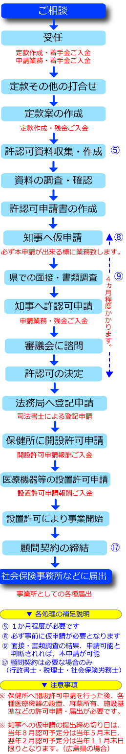 また、その後にも保健所に対し、開設許可申請または開設届を行い、税務署や社会保険事務所にも各種届出が必要なので、先生方には大変な労力とお時間が必要とならざるを得ません。