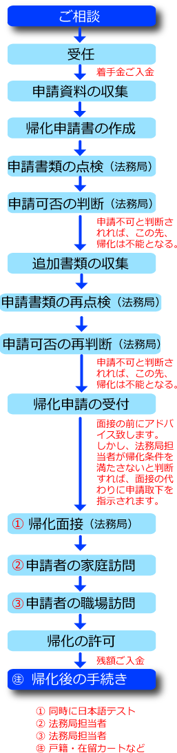 また、帰化の申請は法務局で行い、ご本人と法務局審査官との直接面談なども経たうえ、大量の資料提出を求めれれ、審査期間も約1年間を要する、大変厳しい内容となります。そのような手続きを経て、晴れて日本国籍が取得できるというものなのです。