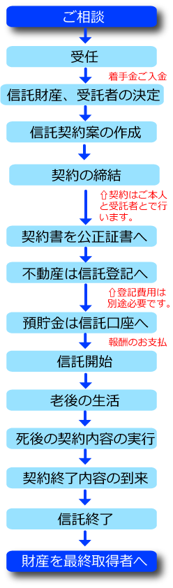 「財産所有者のご本人」と「財産を預かるご家族などの方」との間で信託契約書を作り、公正証書にした上で、不動産であれば登記し直しておいたり、預貯金であれば「信託口座」という別口座で信頼できる家族に管理して貰ったりするものです。ですから、信託契約書は、信託する財産の将来設計書なのです。